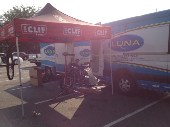 The gun went off at 9:30am, and about 150 competitors made the plunge for three 500m laps, and two short beach runs in between. It was a pretty bumpy start in the small lake. My neoprene cap felt like it was choking me, I was fighting to stay calm, sight the buoy, not get kicked or punched in the face, swim hard and find some feet to draft all at the same time – oh, isn’t open water swimming fun! By the second buoy I was in a small pack and drafting. I figured it was an okay pace, as any attempts to pull out and around the two in front of me failed. The funny part, I discovered later was that the two I was swimming with were the same two I’d swam with a month earlier at the Xterra Enduro – I guess we naturally found each other again!